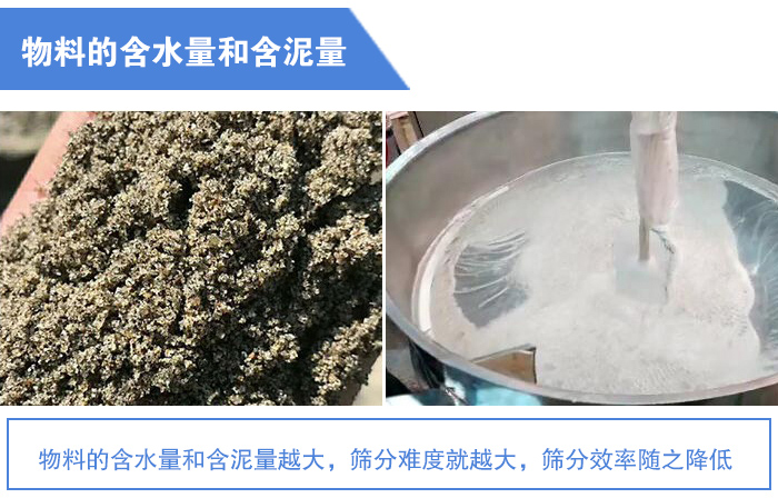 如果物料中包含的表面水分在一定程度內(nèi)增加,那它的粘滯性就會增大,造成細(xì)粒互相粘結(jié)成團(tuán),并附著在大顆粒上;同時還有物料中包含的粘性物質(zhì),很容易把篩孔堵住。這些都大大降低了篩分效率。