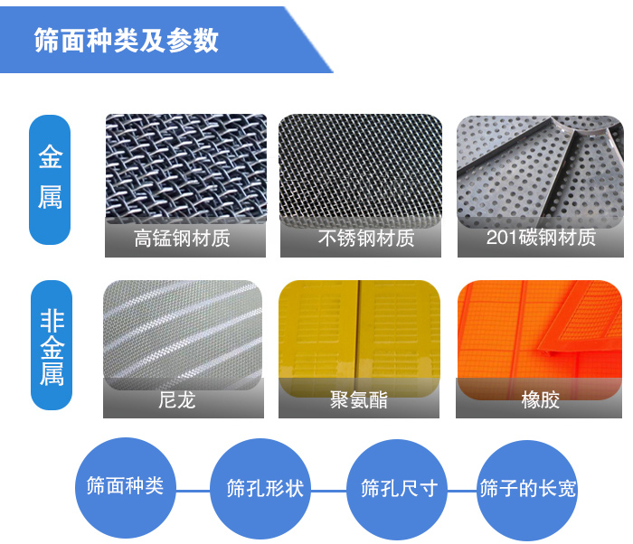 篩子的工作面通常有三種,鋼棒制造的、鋼絲編織的和鋼板沖孔的。它們對篩分效率的影響主要和它們的有效面積有關(guān),有效面積愈大的篩面,篩孔占的面積愈多,礦粒就更容易透過篩孔,這樣篩分效率就會變高,但相對的篩面壽命會較短。因此選擇篩面要根據(jù)實際情況。
