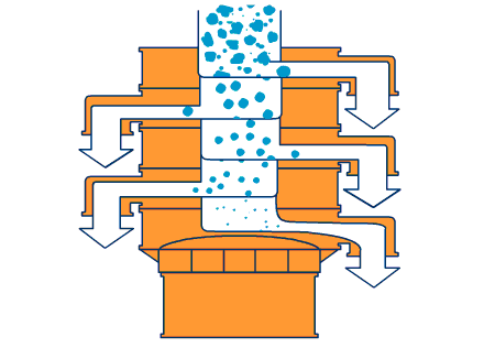 DH-600-3S型篩分機(jī)采用YZUL立式振動(dòng)電機(jī)作為激振源,通過振動(dòng)電機(jī)上下兩端的偏心重錘將旋轉(zhuǎn)運(yùn)動(dòng)轉(zhuǎn)變?yōu)樗?、垂直、傾斜的三次元運(yùn)動(dòng),并傳遞到篩粉機(jī)的篩面上;物料通過入料口進(jìn)入設(shè)備內(nèi),根據(jù)不同物料篩分要求,物料經(jīng)過1-5層采用不同目數(shù)的金屬編織篩網(wǎng)的篩分層,在這個(gè)過程中,位于各層的篩網(wǎng)下的清網(wǎng)裝置(彈跳球)通過頻率振動(dòng)不斷撞擊篩網(wǎng),使篩網(wǎng)上層物料能夠順暢的透網(wǎng)篩分,并有效解決了物料堵網(wǎng)問題出現(xiàn),不同目數(shù)的物料通過各層對(duì)應(yīng)目數(shù)的篩網(wǎng)后在各層的出料口排出,實(shí)現(xiàn)篩選除雜或過濾分級(jí)的目的。調(diào)節(jié)上、下兩端的相位角,可以改變物料在篩面上的運(yùn)動(dòng)軌跡。